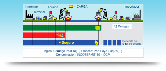 CPT (Carriage paid to / Transporte pagado hasta)... lugar de destino convenido. "Transporte pagado hasta" significa que el vendedor realiza la entrega de la mercancía cuando la pone a disposición del transportista designado por él; siendo el vendedor el que, además, debe pagar los costes del transporte necesario para llevar la mercancía al destino convenido. Esto significa que el comprador asume todos los riesgos y cualquier otro coste contraido después de que la mercancía haya sido así entregada.