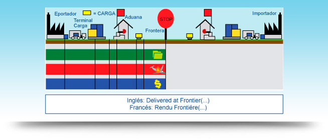 DAF (Delivered at Frontier / Entregada en frontera)... lugar convenido. "Entregadas en frontera" significa que el vendedor realiza la entrega cuando la mercancía es puesta a disposición del comprador sobre los medios de transporte utilizados y no descargados, en el punto y lugar de la frontera convenidos, pero antes de la aduana fronteriza del país colindante, debiendo estar la mercancía despachada de exportación pero no de importación. El término "frontera" puede usarse para cualquier frontera, incluida la del país de exportación. Por lo tanto, es de vital importancia que se defina exactamente la frontera en cuestión, designando siempre el punto y el lugar convenidos a continuación del término DAF.