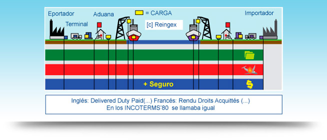 DDP (Delivered Duty Paid / Entregada derechos pagados)... lugar de destino convenido. "Entregada derechos pagados" significa que el vendedor realiza la entrega de la mercancía al comprador, despachada para la importación y no descargada de los medios de transporte, a su llegada al lugar de destino convenido. El vendedor tiene las mismas obligaciones que bajo DDU, pero además paga los derechos de la importación de la mercancía. Supone la mayor obligación y riesgos para el vendedor dentro de los Incoterms.