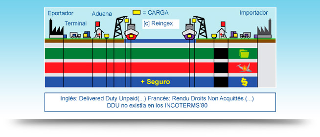 DDU (Delivered duty Unpaid / Entregada derechos no pagados)... lugar de destino convenido. "Entregada derechos no pagados" significa que el vendedor realiza la entrega de mercancía al comprador, no despachada de aduana para la importación y no descargada de los medios de transporte, a su llegada al lugar de destino convenido. El vendedor debe asumir todos los costes y riesgos contraidos al llevar la mercancía hasta aquel lugar.