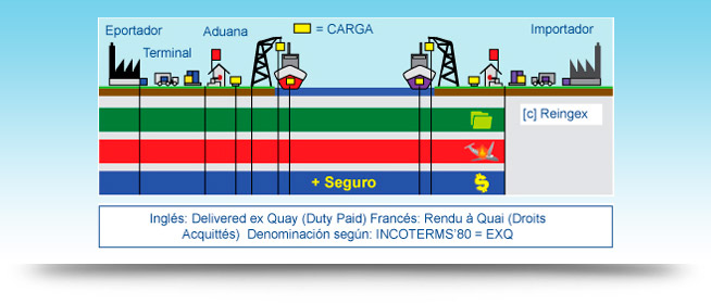 DEQ (Delivered Ex Quay / Entregada en muelle)... puerto de destino convenido. "Entregada en muelle" significa que el vendedor realiza la entrega cuando la mercancía es puesta a disposición del comprador, sin despachar de aduana para la importación, en el muelle (desembarcadero) del puerto de destino convenido. El vendedor debe asumir los costes y riesgos ocasionados al llevar la mercancía sobre muelle (desembarcadero). El término DEQ exige del comprador el despacho aduanero de la mercancía para la importación y el pago de todos los trámites, derechos, impuestos y demás cargas exigibles a la importación.