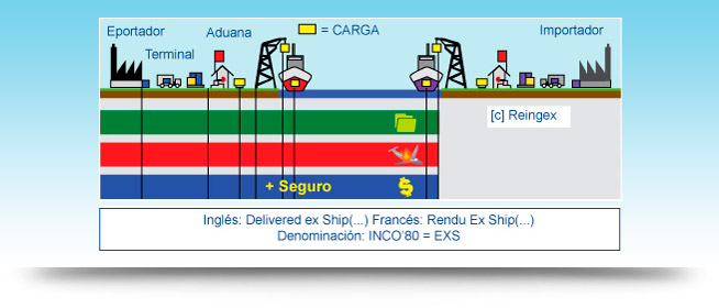 DES (Delivered Ex Ship / Entregada sobre buque)... puerto de destino convenido. "Entregada sobre buque" significa que el vendedor realiza la entrega cuando la mercancía es puesta a disposición del comprador a bordo del buque, no despachada de aduana para la importación, en el puerto de destino convenido. El vendedor debe soportar todos los costes y riesgos inherentes al llevar la mercancía al puerto de destino acordado con anterioridad a la descarga.