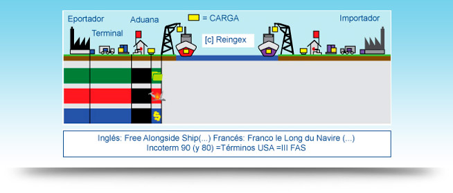 FAS (Free Alongside Ship / franco al costado del buque)... puerto de carga convenido). "Franco al costado del buque" significa que el vendedor realiza la entrega cuando la mercancía es colocada al costado del buque en el puerto de embarque convenido. Esto quiere decir que el comprador ha de soportar todos los costes y riesgos de pérdida o daño de la mercancía desde aquel momento. El término FAS exige al vendedor despachar la mercancía en aduana para la exportación.
